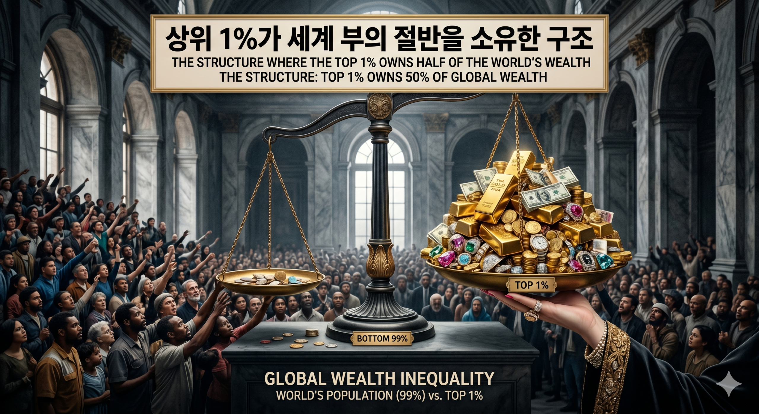 2024년 크레디트스위스의 글로벌 부의 보고서에 따르면, 전 세계 상위 1%가 전체 부의 약 45%를 소유하고 있습니다. 반면 하위 50%는 전체 부의 단 1%만 가지고 있습니다. 이 수치는 계속 악화되고 있습니다. 20년 전만 해도 상위 1%의 지분은 35% 수준이었습니다. 부자는 더 부자가 되고, 가난한 사람은 더 가난해지는 구조가 심화되고 있는 것입니다. 우리는 인류 역사상 가장 불평등한 시대를 살고 있습니다.